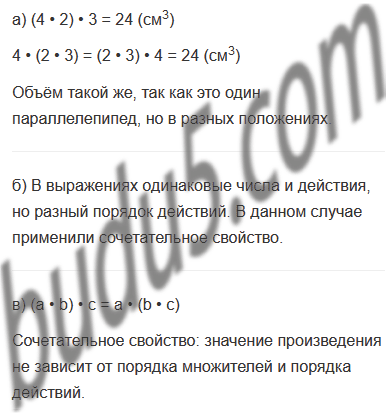 а) Измерения прямоугольного параллелепипеда 2 см, 4 см и 3 см. Объясни по рисункам, что означают выражения, и найди их значения. Что ты замечаешь?