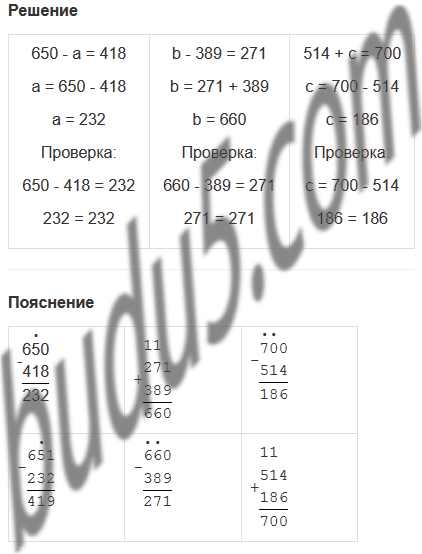 | 640 - а = 418 | b - 389 = 271 | 514 + с = 700 |