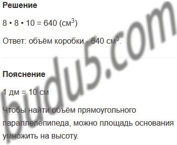 Задание № 10. Основанием коробки является квадрат со сторонами 8 см, а высота равна 1 дм. Найди объём коробки. (Обрати внимание на единицы измерения!)