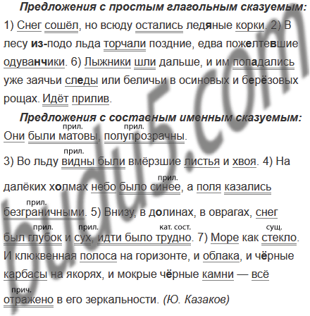 1) Снег сошёл, но всюду остались лед..ные корки. Они были матовы, полупрозрачны. 2) В лесу (из)подо льда торчали поздние, едва пож..лте..шие одуван(?)чики. 3) Во льду видны были вмёрзшие листья и хвоя. 4) На далёких х..лмах небо было синее, а поля казались безграничными. 5) Внизу, в д..линах, в оврагах, снег был глубок и сух, идти было трудно. 6) Лыжники шли дальше, и им поп..дались уже заячьи сл..ды или беличьи в осиновых и б..рёзовых рощах.4 7) Море как стекло. И клюквенная полоса на горизонте, и облака, и ч..рные карбасы на якорях, и мокрые ч..рные камни — всё отражено в его зеркальности. Идёт прилив. (Ю. Казаков)