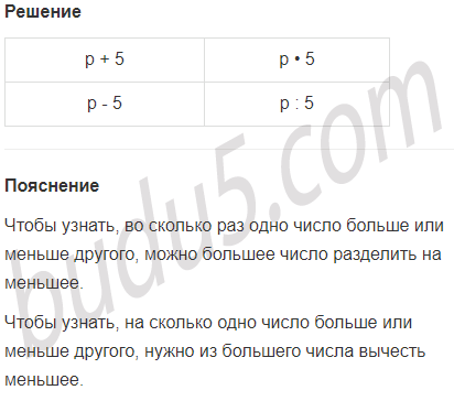 | б) на 5 меньше числа р | г) в 5 раз меньше числа р |