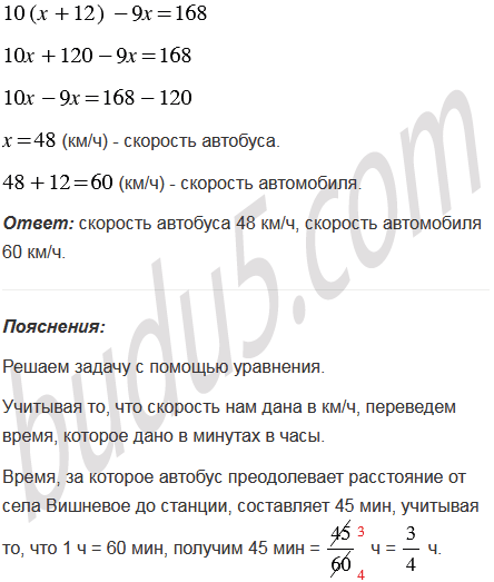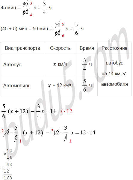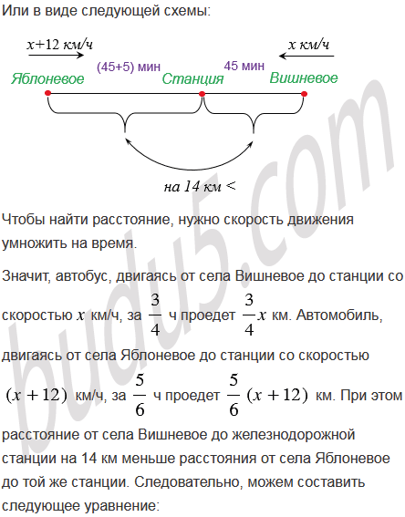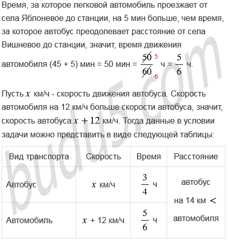 Расстояние от села Вишневое до железнодорожной станции на 14 км меньше расстояния от села Яблоневое до той же станции. Время, за которое автобус преодолевает расстояние от села Вишневое до станции, составляет 45 мин, а время, за которое легковой автомобиль проезжает от села Яблоневое до станции, на 5 мин больше, причем скорость автомобиля на 12 км/ч больше скорости автобуса. Найдите скорость автобуса и скорость легкового автомобиля.
