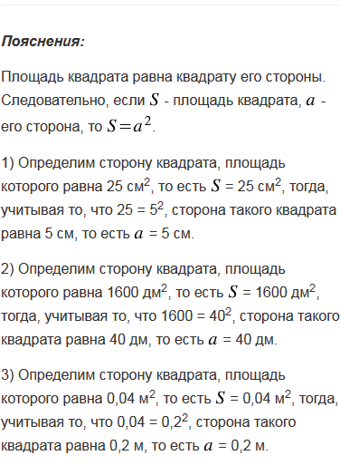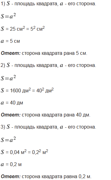 Найдите сторону квадрата, площадь которого равна: 1) 25 см2; 2) 1600 дм2; 3) 0,04 м2.
